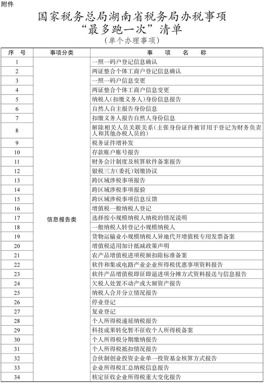 为进一步方便纳税人办理税收业务,切实优化税收营商环境,根据《全国税务机关纳税服务规范(3.0版)》,国家税务总局湖南省税务局结合实际,全面梳理和更新《办税事项“最多跑一次”清单》(以下简称《清单》)共178项业务,其中:单个办理事项149项,并联办理事项29项。现予以发布,并就有关问题公告如下: