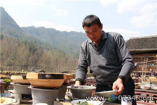 全庆庚介绍,每逢暑假都是农家乐最忙的时候,一个中午可能就要接待20多桌游客。“我的左脚是股骨头坏死,没办法弯腰蹲下,人多的时候,我忙不过来就会请周边乡亲过来帮厨,一天70至150元不等,多是请贫困户过来,这样也可以让他们赚点钱。”全庆庚介绍,为了丰富游客的体验,带动村民增加收入,院子的一端,苏木绰阳戏剧团会相应的进行本地特色戏剧表演,游客可通过点戏,一边吃饭,一边看戏,一顿饭吃的无比热闹,同时,在农家乐内还可以购买农户的土鸡、剁辣椒、香肠腊肉、土鸡蛋、土家织锦等“伴手礼”。