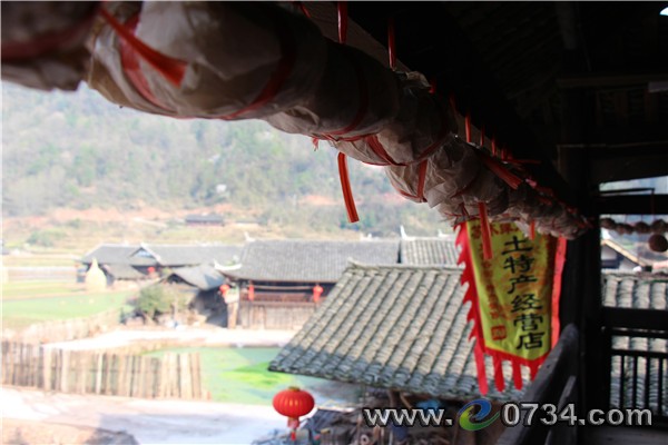 土特产经营店内,葛根粉排成一排挂在吊脚楼檐下