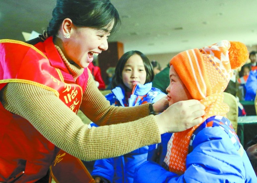 2017年12月29日,临武县成仙观社区,义工为学生穿上新棉衣。当天,该县开展“爱在临武,我们一起温暖寒冬”爱心活动,来自山区的72名贫困学生领到了“壹基金”捐赠的装有棉衣、帽子、围巾、书包等物品的温暖包。陈卫平 王忠文 摄影报道
