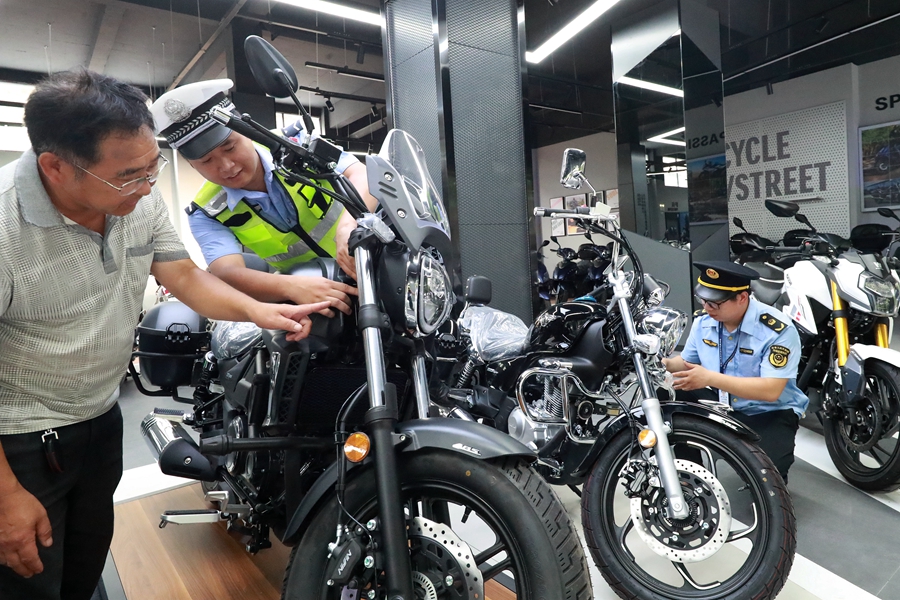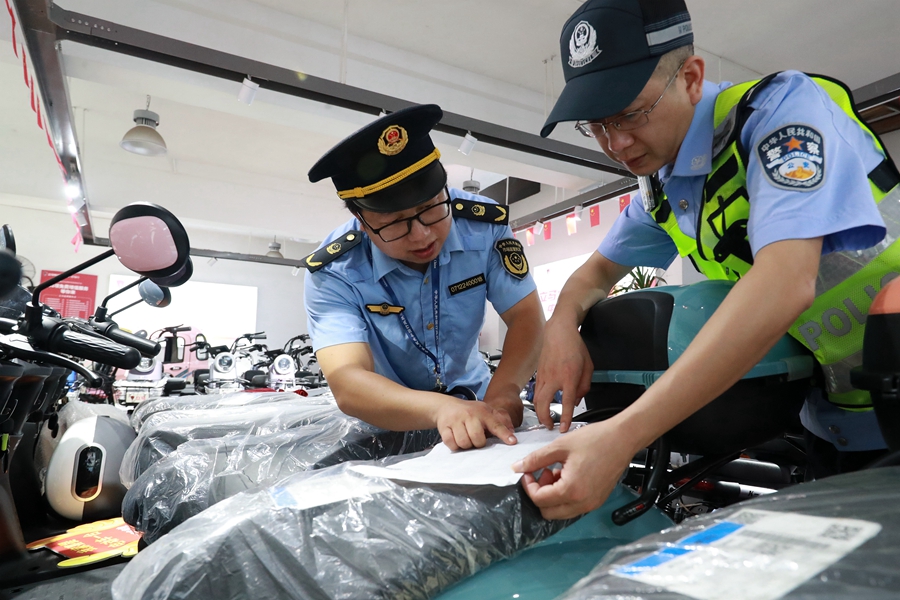 6月30日,通道侗族自治县双江镇城南街电摩车行,市场监管执法人员联合公安交警对辖区销售的电摩、头盔等产品进行监督检查。连日来,该县交通顽疾整治办以“全链条、全领域、全方位”的执法整治思路,组织职能部门严查不合格车辆、非标车辆、拼改装车辆进入销售市场,消除交通安全隐患问题,保障群众出行安全。 刘强 宋玲玲 摄影报道