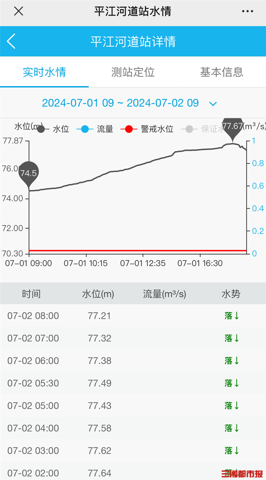 7月2日,记者从湖南省水利厅了解到,截至2日8时,汨罗江平江站水位已经下降到77.21米,相比于洪峰水位77.67米下降了0.46米。