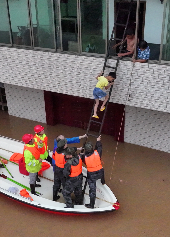 7月28日,资兴市唐洞街道镜塘村,救援队员在转移被困群众。受台风“格美”影响,该市出现持续强降雨。当地迅速启动防汛应急响应,全力保障人民群众生命安全,力求最大程度减少损失。 李科 黄珊珊 摄影报道(湖南图片库)