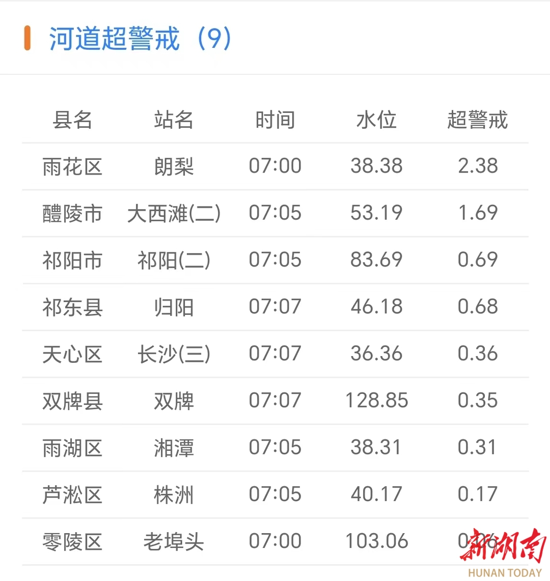 自6月25日以来,湘江、资水及洞庭湖区共有18站次超警戒,截至6月26日7时,仍有9站超警戒水位,这9站全部位于湘江流域。