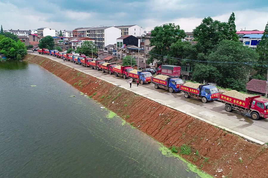 7月11日,华容县华容河潘华大桥西侧大堤上,“以车代仓”应急抢险车队严阵以待。为了有效提升全域防汛应急抢险工作能效,该县从去年开始试行“车船代仓”新模式,将以往定点储存的防汛物资装船上车,提升了调运机动性。 徐典波 吴巍伟 摄影报道