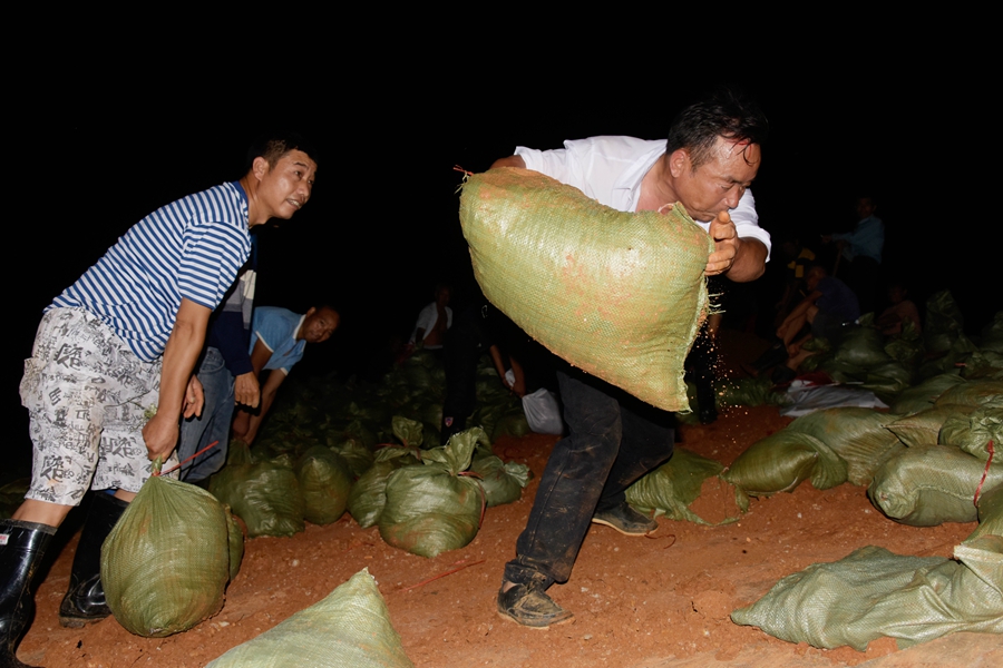 7月17日晚,澧县涔南镇上河口村,干群奋力搬运土袋除险。当天下午,涔南镇黄云河涵闸出现渗漏险情,镇指挥部迅速调动劳动力200余人,用土袋填充方式堵住涵闸渗水处,排除险情。 柏依朴 摄