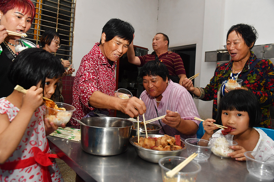 7月9日晚,攸县莲塘坳镇中学临时安置点,刚被转移出来的群众吃上了可口的热饭热菜。洪灾发生后,该镇干群积极展开被困人员搜救、转移和安抚工作。被转移群众除投亲靠友外,都集中进行了妥善安置。湖南日报记者 郭立亮 摄