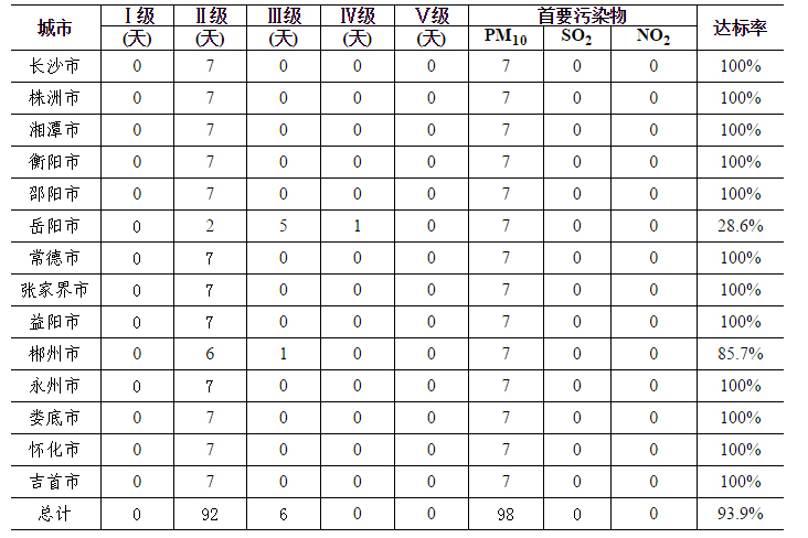2014年10月10—16日,岳阳、郴州环境空气均出现轻度污染。14个城市达标率在28.6-100%之间。全省空气质量达标率为93.9%,与上周相比下降1个百分点。统计数据见下表: