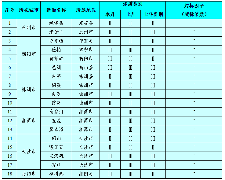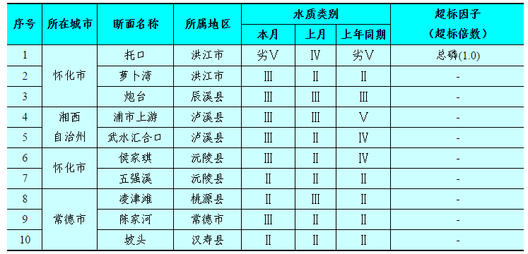 湖南省环境监测结果表明:全省共109个省控地表水断面,本月水质总体为良。四水流域中,湘江、资江和澧水流域水质为优;沅江流域水质为良,主要污染指标为总磷和氨氮。洞庭湖营养状态为中营养,水质总体为中度污染。