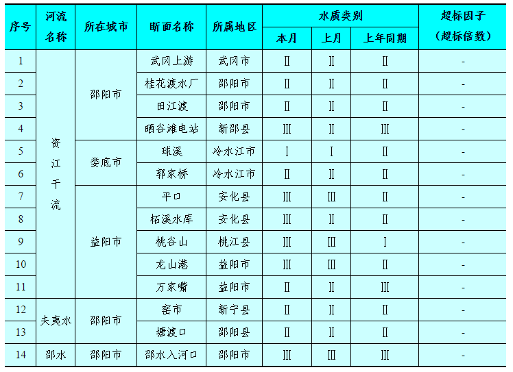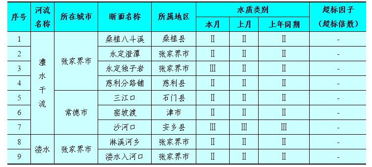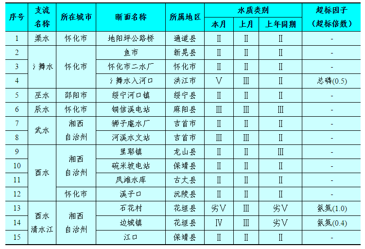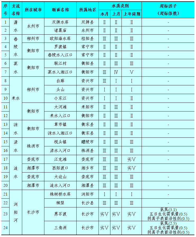 四水流域:湘江流域水质总体为优。干、支流42个省控断面中,Ⅰ~Ⅲ类水质断面40个,占95.2%;劣Ⅴ类断面2个,占4.8%。干流18个省控断面水质均符合或优于Ⅲ类标准。支流浏阳河黑石渡和三角洲断面水质均属劣Ⅴ类,污染指标为氨氮、总磷、化学需氧量、五日生化需氧量、阴离子表面活性剂和溶解氧。资江流域水质总体为优。干、支流14个省控断面水质均符合或优于Ⅲ类标准,Ⅰ~Ⅲ类水质比例为100%。沅江流域水质总体为良。干、支流25个省控断面中,Ⅰ~Ⅲ类水质断面21个,占84.0%;Ⅳ类和Ⅴ类水质断面各1个,占4.0%;劣Ⅴ类水质断面2个,占8.0%。干流入境托口断面属劣Ⅴ类水质,污染指标为总磷;支流氵舞 水的入河口断面水质属Ⅴ类,污染指标为总磷;酉水清水江的石花村和边城镇断面水质分别属劣Ⅴ类和Ⅳ类,污染指标为氨氮。澧水流域水质总体为优。干、支流9个省控断面水质均符合或优于Ⅲ类标准,Ⅰ~Ⅲ类水质比例为100%。