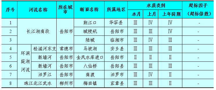 其他流域:长江湖南段、环洞庭湖河流和珠江北江武水的8个断面水质均符合或优于Ⅲ类标准。