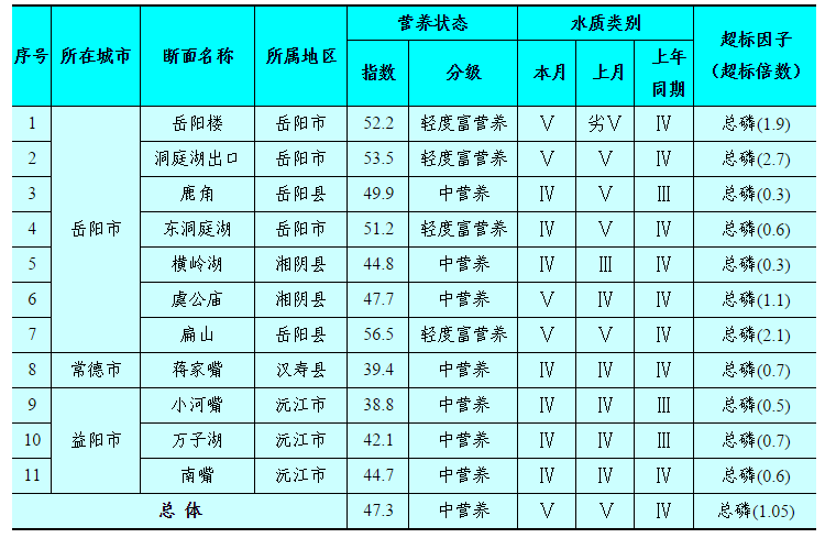 洞庭湖:洞庭湖水质总体为中度污染,营养状态为中营养。11个省控断面中,Ⅳ类水质断面7个,占63.6%;Ⅴ类水质断面4个,占36.4%,污染指标为总磷。