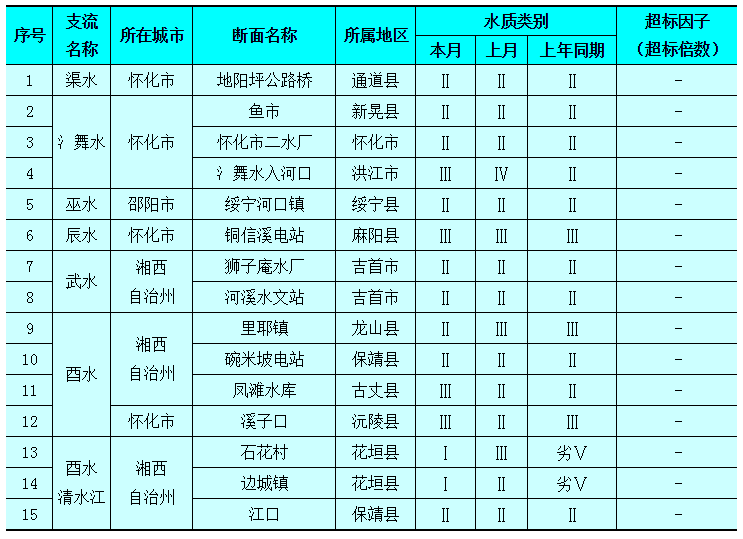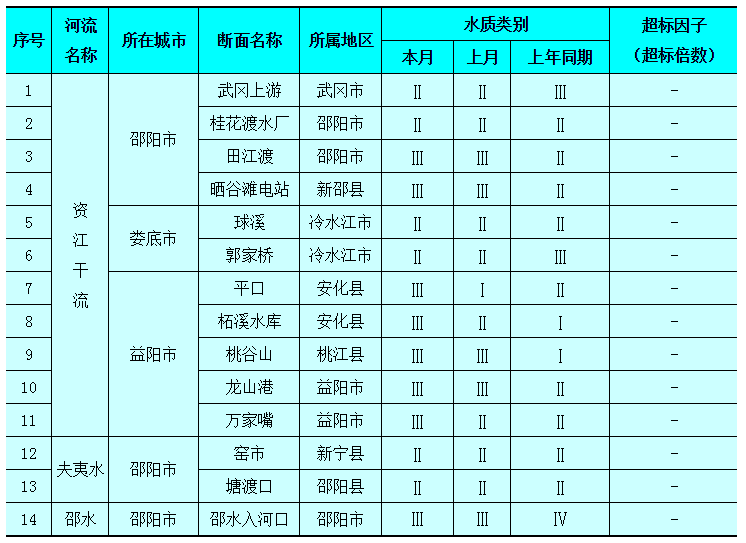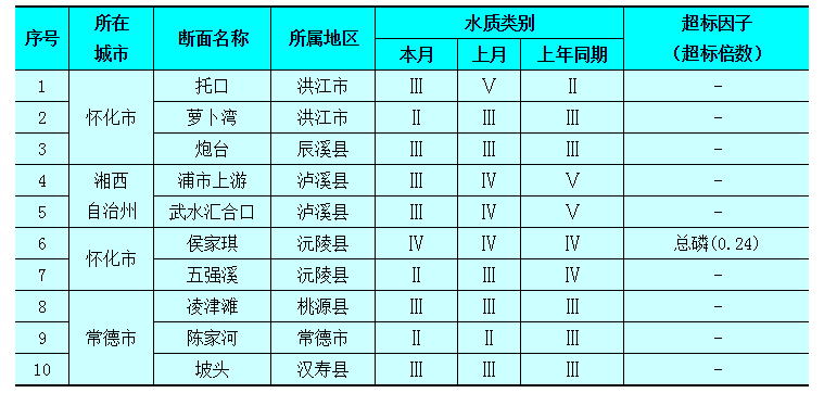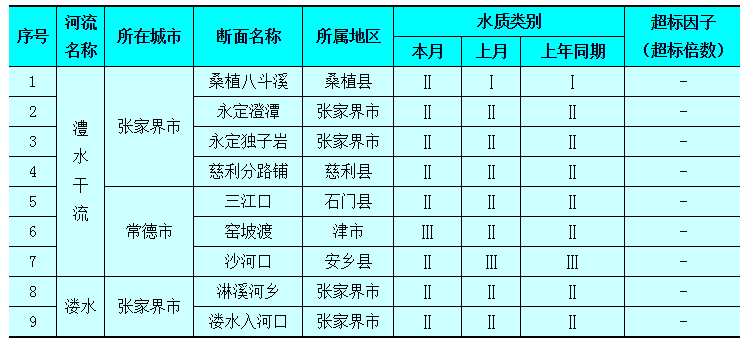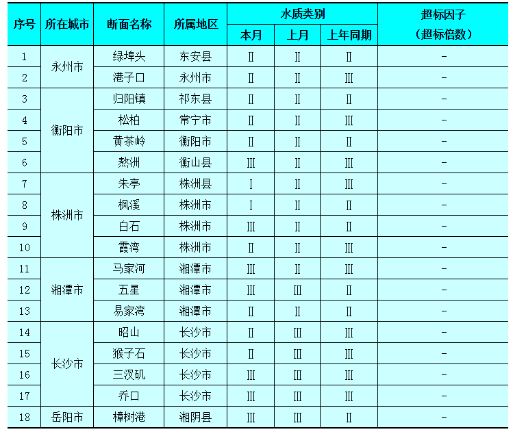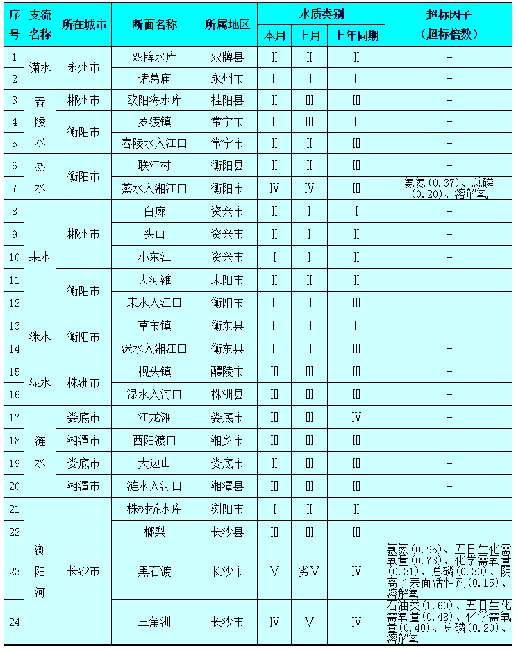四水流域:湘江流域水质总体为优。湘江流域水质总体为优。干、支流42个省控断面中,Ⅰ~Ⅲ类水质断面39个,占92.8%;Ⅳ类断面2个,占4.8%;Ⅴ类断面1个,占2.4%。干流18个省控断面水质均符合或优于Ⅲ类标准。支流蒸水的入湘江口断面水质属Ⅳ类,污染指标为氨氮、总磷、溶解氧;浏阳河黑石渡断面水质属Ⅴ类,污染指标为氨氮、五日生化需氧量、化学需氧量、总磷、阴离子表面活性剂和溶解氧;浏阳河三角洲断面水质属Ⅳ类,污染指标为石油类、五日生化需氧量、化学需氧量、总磷和溶解氧。资江流域水质总体为优。干、支流14个省控断面水质均符合或优于Ⅲ类标准,Ⅰ~Ⅲ类水质比例为100%。沅江流域水质总体为优。干、支流25个省控断面中,Ⅰ~Ⅲ类水质断面24个,占96.0%;Ⅳ类水质断面1个,占4.0%。干流侯家琪断面属Ⅳ类水质,污染指标为总磷。澧水流域水质总体为优。干、支流9个省控断面水质均符合或优于Ⅲ类标准,Ⅰ~Ⅲ类水质比例为100%。