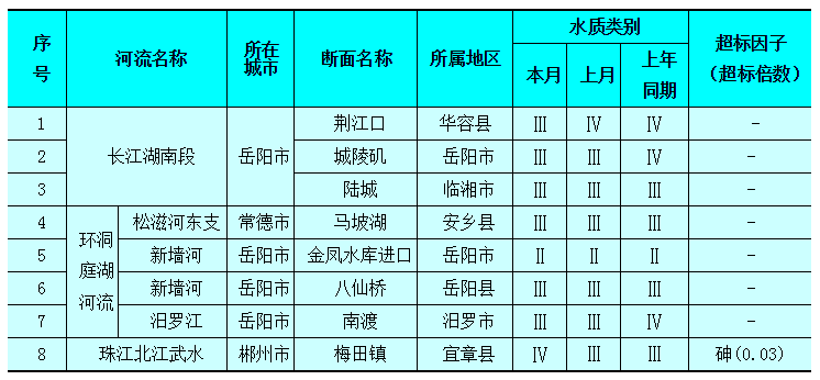 其他流域:长江湖南段、环洞庭湖河流和珠江北江武水的8个断面中,珠江北江武水的梅田镇断面水质属Ⅳ类,污染指标为砷;其余7个断面水质均符合或优于Ⅲ类标准。