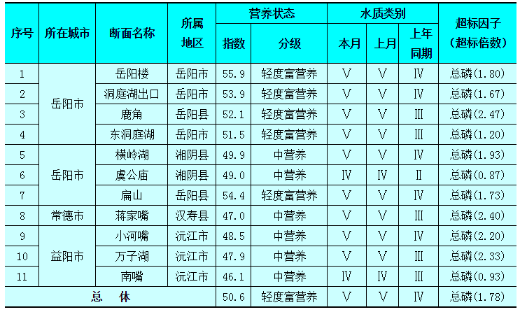 洞庭湖:洞庭湖总体为中度污染,营养状态为轻度富营养。11个省控断面中,Ⅳ类水质断面2个,占18.2%;Ⅴ类水质断面9个,占81.8%,污染指标均为总磷。