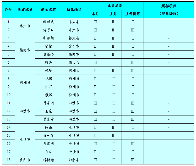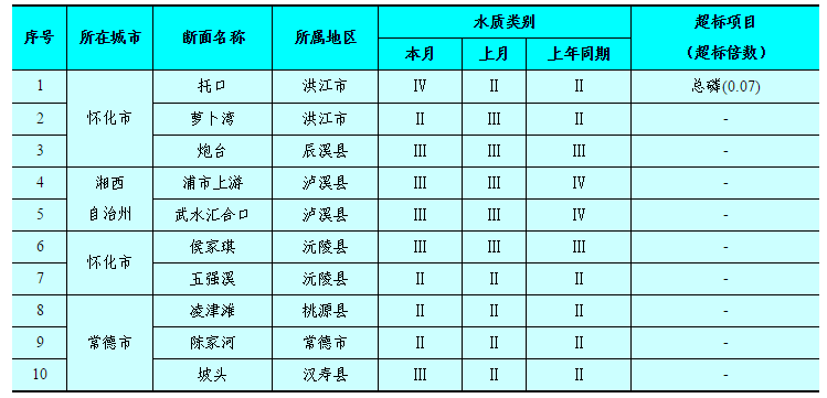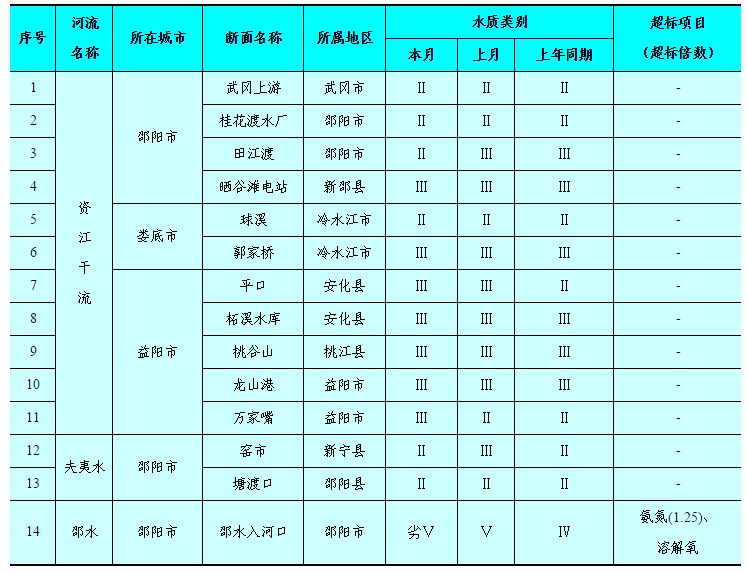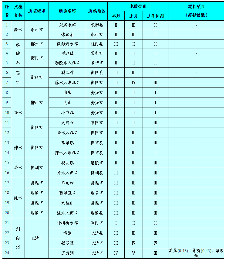 湘江流域水质总体为优。干、支流42个省控断面中,Ⅰ~Ⅲ类水质断面41个,占97.6%;Ⅳ类断面1个,占2.4%。干流18个省控断面水质均符合或优于Ⅲ类标准。支流24个省控断面中,有23个省控断面水质全部符合或优于Ⅲ类标准,浏阳河三角洲断面水质属Ⅳ类,污染指标为氨氮、总磷和溶解氧。资江流域水质总体为优。Ⅰ~Ⅲ类水质断面13个,占92.9%,支流邵水入河口属劣Ⅴ类水质,污染指标为氨氮和溶解氧。沅江流域水质总体为优。干、支流25个省控断面中,Ⅰ~Ⅲ类水质断面24个,占96.0%;Ⅳ类水质断面1个,占4.0%。干流入境托口断面属Ⅳ类水质,污染指标为总磷。澧水流域水质总体为优。干、支流9个省控断面水质均符合或优于Ⅲ类标准,Ⅰ~Ⅲ类水质比例为100%。