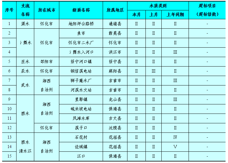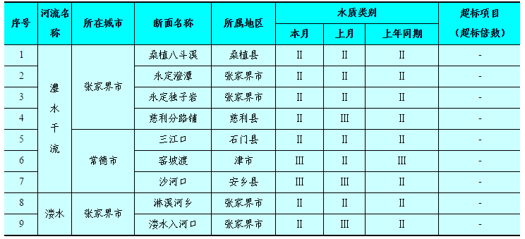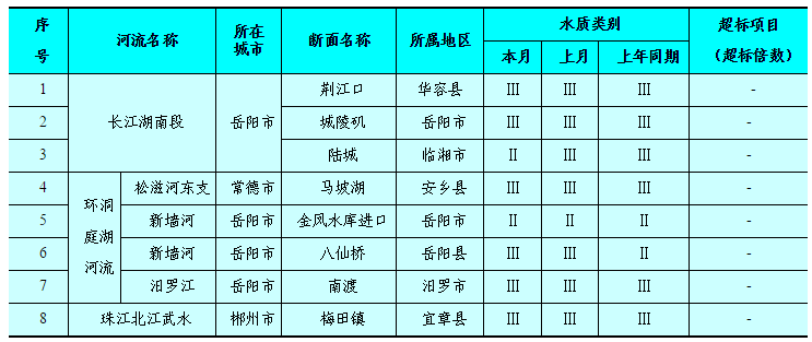 其他流域:长江湖南段、环洞庭湖河流和珠江北江武水的8个断面均符合或优于Ⅲ类标准。