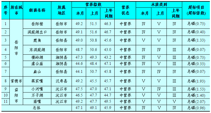 洞庭湖:洞庭湖总体为轻度污染,营养状态为中营养。11个省控断面中,Ⅳ类水质断面6个,占54.5%;Ⅴ类水质断面5个,占45.5%,污染指标均为总磷。