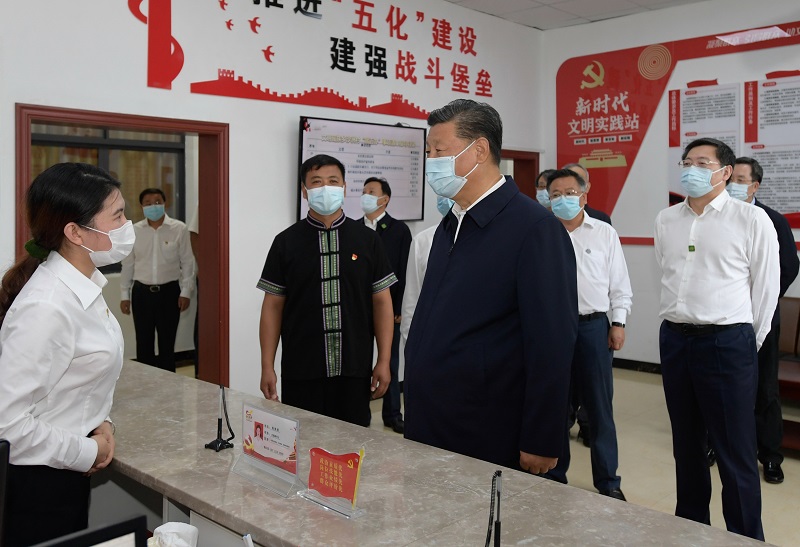 2020年9月16日至18日,中共中央总书记、国家主席、中央军委主席习近平在湖南考察。这是16日下午,习近平在郴州市汝城县文明瑶族乡沙洲瑶族村服务中心,了解基层公共服务工作情况。新华社记者 李学仁 摄