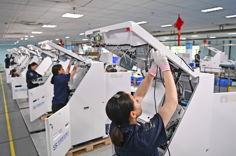 5月30日,长沙经开区长城信息股份有限公司,工人在生产智能柜员机。该公司建有各类金融设备生产线14条,年整机生产能力超100万台/套,生产的设备广泛应用于银行在乡村的线下物理渠道建设,借助物联网和大数据技术,有效减轻银行的乡村渠道建设与运营成本,助力乡村振兴。 湖南日报全媒体记者 李健 摄