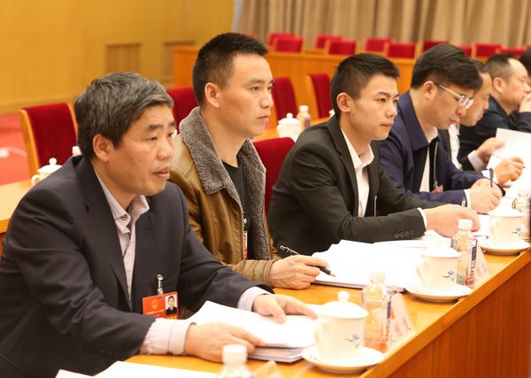 湖南代表团金进尧代表(右一)在发言时呼吁国家立法禁止生产一次性塑料和泡沫制品。