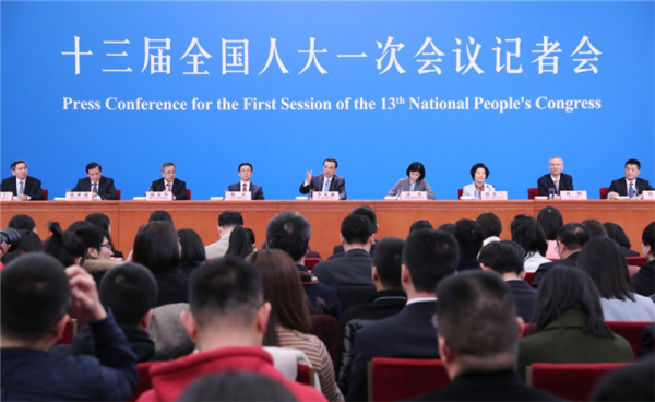 十三届全国人大一次会议3月20日上午在人民大会堂举行记者会,国务院总理李克强应大会发言人张业遂的邀请会见中外记者,并回答记者提问。国务院副总理韩正、孙春兰、胡春华、刘鹤参加。