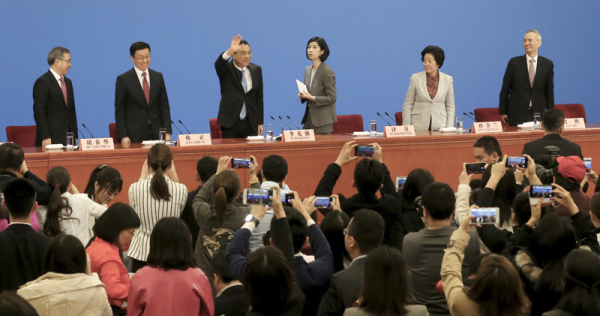 3月20日,十三届全国人大一次会议在北京人民大会堂举行记者会,国务院总理李克强应大会发言人张业遂的邀请会见中外记者,并回答记者提问。国务院副总理韩正、孙春兰、胡春华、刘鹤参加。新华社记者 王晔 摄