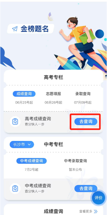 打开“湘易办”APP/支付宝小程序,点击首页金刚区的“智慧教育”专区或搜索“高考成绩查询”服务,输入考生信息,即可查询高考分数。
