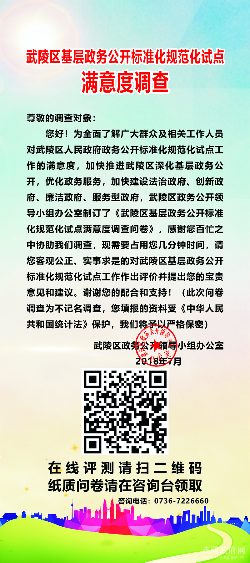 为全面了解您对我区试点工作的满意度,听取您的建议,进一步优化试点工作效果。7月23日起,您可以通过网上填写问卷、现场填写问卷等方式参与“武陵区基层政务公开标准化规范化试点满意度调查”。