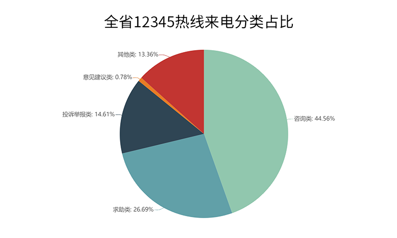 7月的群众来电中,咨询类209816通,占比44.56%;求助类125668通,占比26.69%;投诉举报类68776通,占比14.61%;意见建议类3680通,占比0.78%;其他类(表扬、批评、骚扰电话等)62929通,占比13.36%。