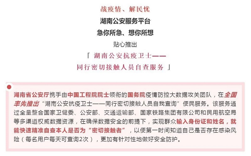 此外,湖南公安在湖南公安服务平台新增“新型冠状病毒确诊患者同行程查询”“发热门诊地图”“湖南接待疫源地人员地点服务场所”等功能,方便企业和返工人员自查风险,及时采取措施。通过深入分析确诊病例轨迹,摸排出与确诊病例密切接触“六同”人员2.8万余人,联合省通信管理局、省卫健委发出风险提示短信,引导居家隔离或主动就医,有力促进了复工企业的内部防范管理。
