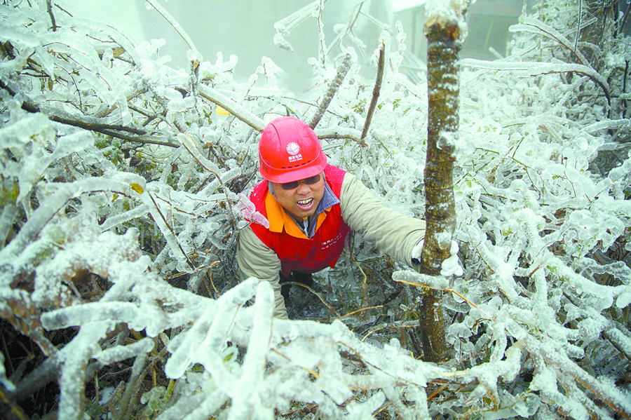 1月5日,龙山县里耶镇自生桥村,电力工人穿过冰冻的灌木丛,巡视线路。为确保群众正常用电,国网龙山县供电公司20余名党员服务队员主动请缨加入抢险队伍,爬冰卧雪,早出晚归,巡视线路,排查隐患。 田良东 摄