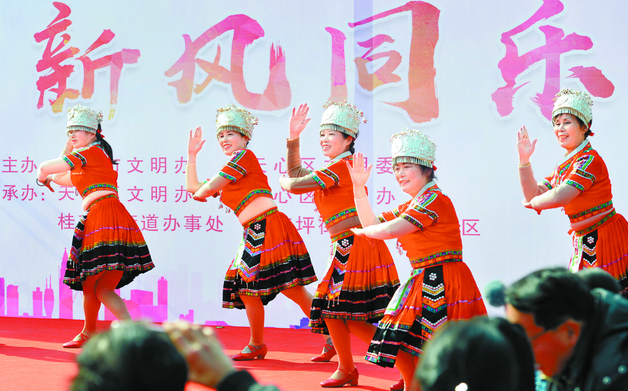 2月6日,长沙市天心区九峰苑社区,居民在表演舞蹈。当天,该社区开展“我们的春节”之两型新风同乐会主题活动,“创意年味”作品制作、剪窗花、两型知识抢答和文艺演出等,促进了居民之间的感情交流,营造出平安、和谐、幸福社区的良好氛围。湖南日报记者 李健 摄