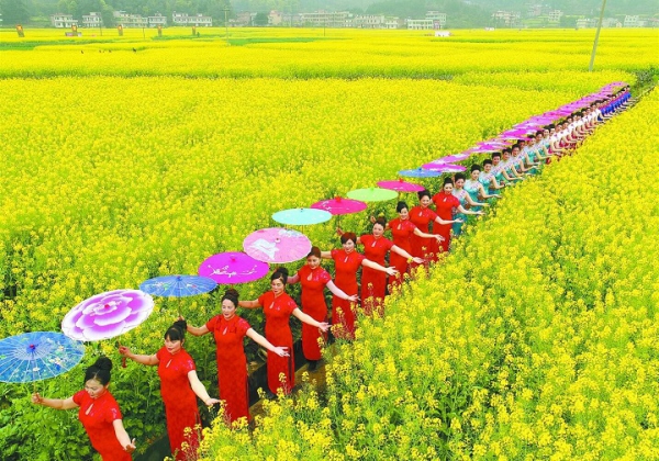 3月17日,旗袍美女在油菜花海里表演赏花走秀。当天,首届湖南油菜花节在衡阳县库宗桥镇华山村开幕。湖南日报记者 郭立亮 通讯员 刘欣荣 摄影报道