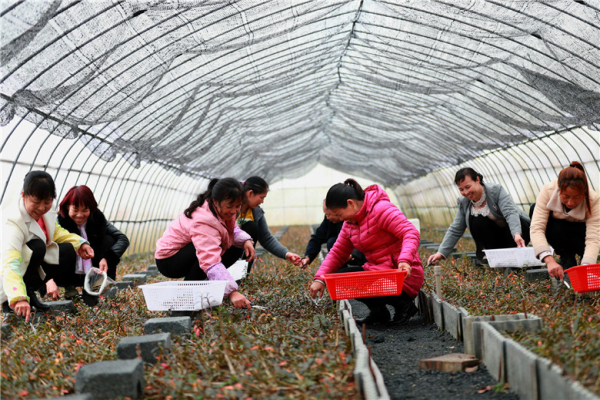 3月18日,通道侗族自治县万佛山镇江寨村,返乡村民在大棚里剪摘铁皮石斛。近年来,该县推进中药材、花卉苗木、油茶等特色产业发展,吸引众多“4050”在外务工人员返乡就业。这种“打工不需远行,家门口能挣钱”的增收模式,加快了当地农民尤其是农村妇女增收致富的步伐。刘强 摄