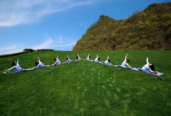 3月26日,瑜伽爱好者在张家界武陵源黄龙洞景区生态广场练瑜伽。当日,张家界雨过天晴,气温回升,人们纷纷走出家门踏青赏花,游玩休闲,享受着身心放松的美好时光。 吴勇兵 摄