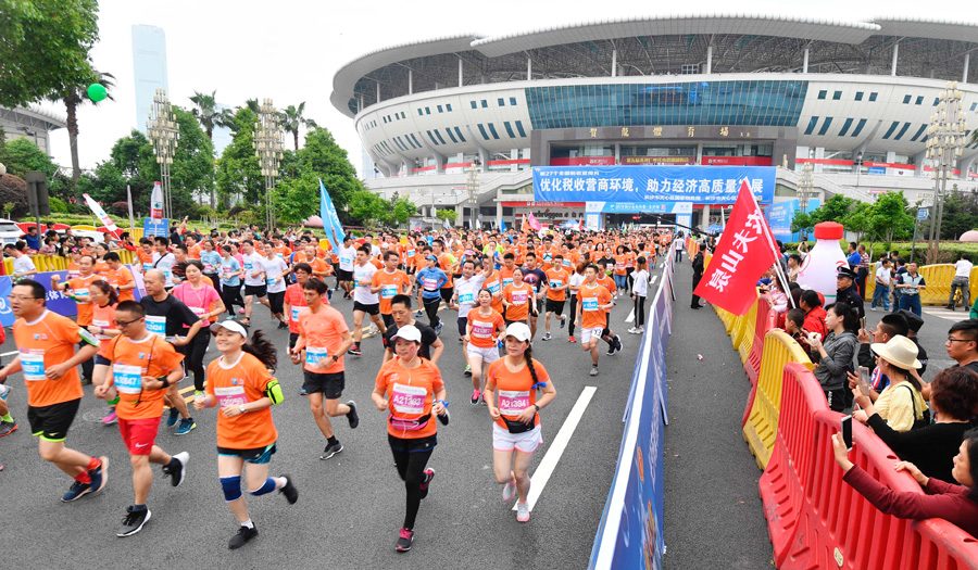 4月22日上午,2018年湘江马拉松赛在长沙贺龙体育场鸣枪开跑,近5000名选手参赛。该赛事今年设长沙、株洲、湘潭、衡阳共4站。湖南日报记者田超 张颐佳 摄影报道