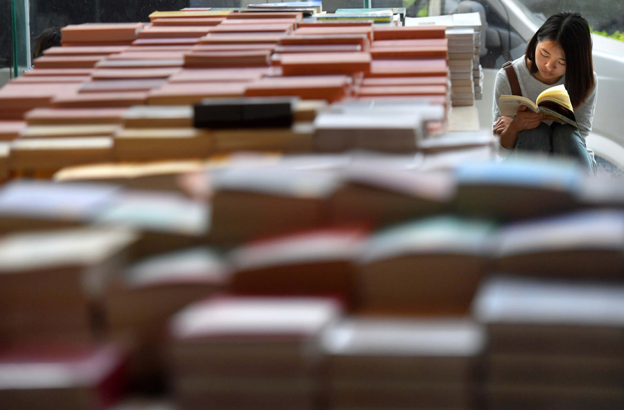 4月20日,湖南图书城,一位读者在“书海”里看书。世界读书日到来之际,长沙市的书店和图书馆纷纷推出“全民阅读”相关活动,吸引广大市民爱上阅读,选购图书。 湖南日报记者 郭立亮 摄
