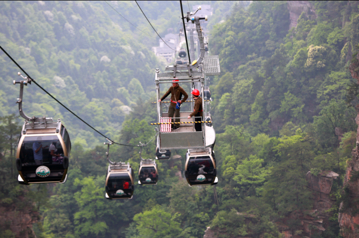 4月26日,张家界武陵源天子山索道工作人员在检查索道运行情况。“五一”临近,该区组织各景区企业对索道、电梯等载人游览工具进行检查,进一步完善旅游接待措施和应急保障预案,保障旅游安全。