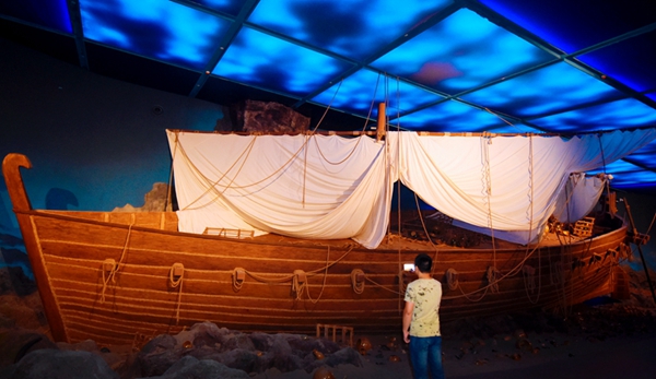 ▲5月14日,等比例还原的“黑石号”沉船在长沙铜官窑博物馆展出。