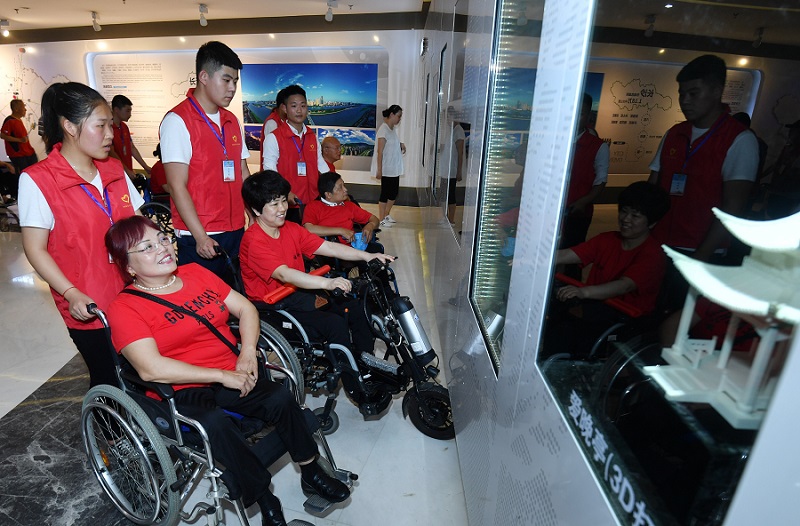 5月17日上午,残障人士在志愿者的帮助下参观长沙市规划展示馆,体验城市规划游戏。当天,长沙市开福区举办“残健携手护蓝天·共圆厚德开福梦”全国助残日主题活动。湖南日报记者 田超 张颐佳 摄影报道