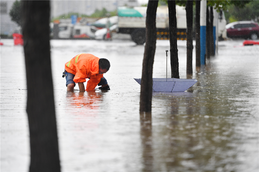 7月12日上午,长沙市岳麓区谷苑路,环卫人员揭开下水井盖,加速排出路面积水。当天,受第8号台风“玛莉亚”影响,暴雨袭击长沙,导致城区部分路段积水。相关部门工作人员全力疏导交通、排除积水,保障市民安全出行。