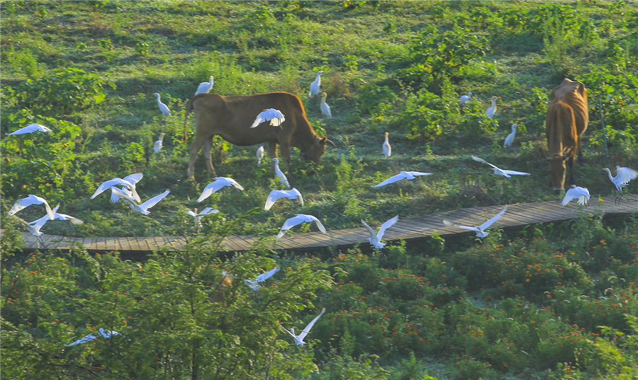 7月28日,花垣县紫霞湖畔,黄牛在悠闲地吃草,一群牛背鹭上下飞舞。近年,该县利用紫霞湖畔的湿地、荒地,发展油茶、桑蚕、牧草、花卉等特色产业,构建出人与自然和谐相处的生态美景。龙艾青 摄
