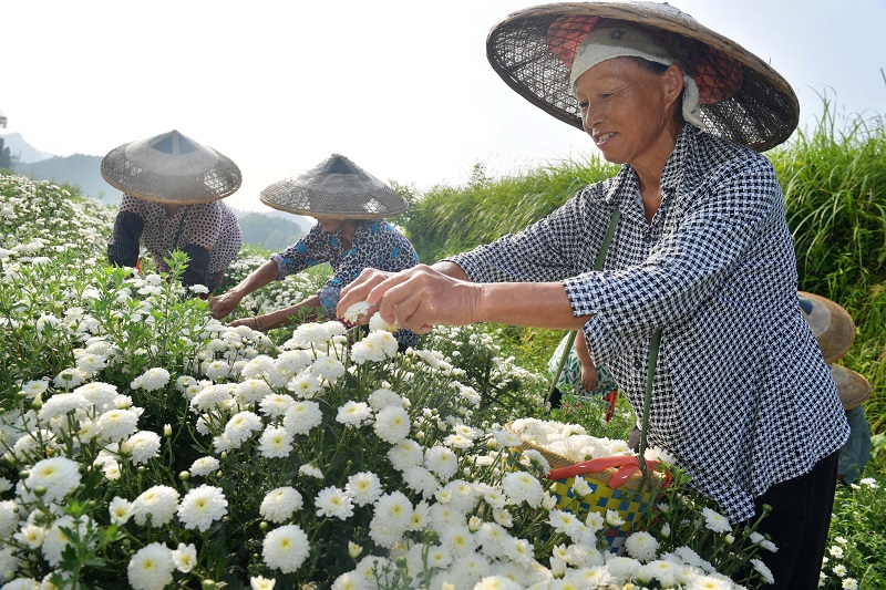 8月14日,凤凰县千工坪镇关田山村,村民在高兴地采摘鲜菊花。去年,该村村支书吴石金投资60万元,引进种植七月菊100亩,并成立专业合作社,带动40多名贫困村民就业增收。湖南日报记者 郭立亮 通讯员 唐金生 摄影报道