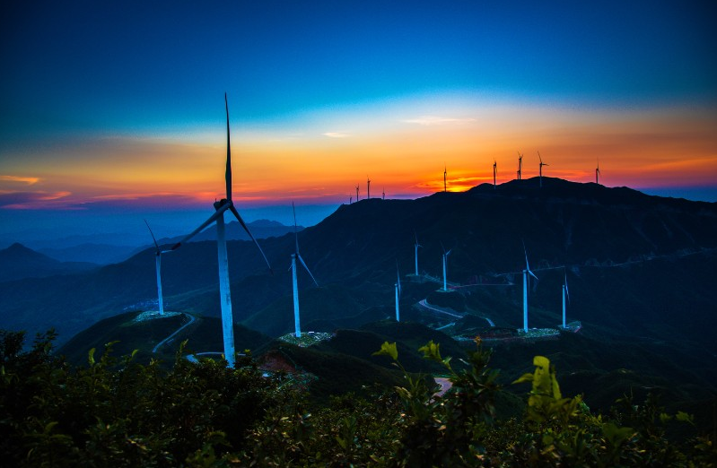 9月3日,桂阳县天塘山风电场美若画卷。近年来,桂阳县风电产业快速发展,先后建成7个风电场,总装机容量35万千瓦。桂阳县地处五岭山脉腹地,境内有长达60多公里的狭长“疾风带”,可开发风能资源100万千瓦,是湖南省风能资源最丰富地区之一。