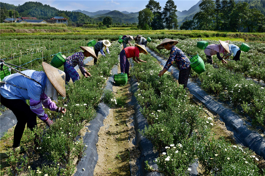 9月5日,洪江市熟坪乡罗翁村,村民在采摘菊花。2015年,该村引进专业合作社发展菊花种植,合作社在菊花种植的田间管理、采花、烘烤等岗位上优先招聘本村贫困户人员。目前,合作社有90名贫困人员就业,每年人均增收2万余元。杨锡建 周婕 摄影报道