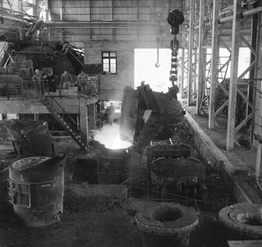 1977年3月23日,涟源钢铁厂,小转炉混铁炉作业区翻铁水。(资料照片) 黎善绍 摄