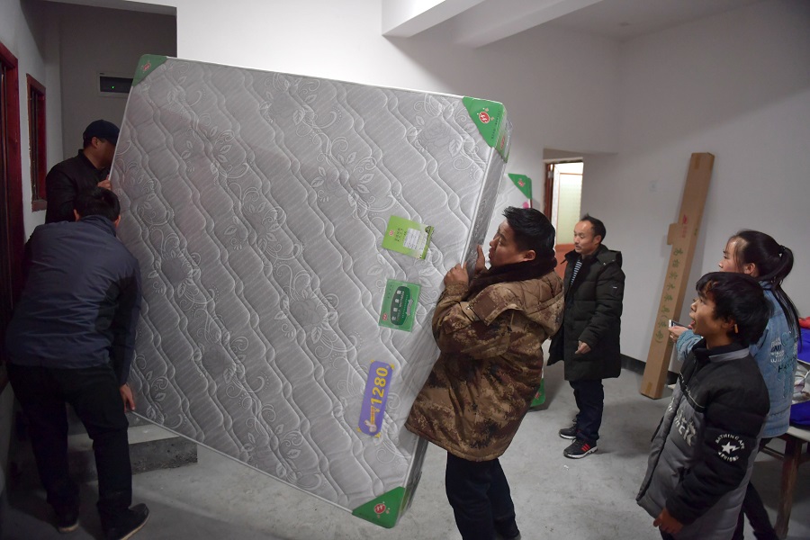 1月21日晚,镇干部吴大雕(中)和扶贫队员帮助夯来村村民隆正发搬运床垫进新家。