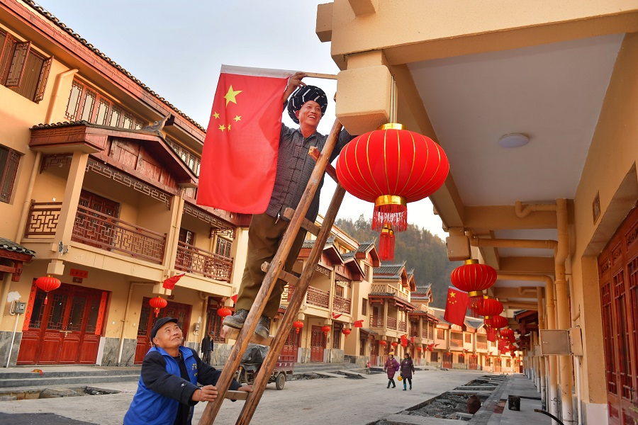 1月22日,凤凰县禾库镇易地扶贫搬迁安置区,村民吴玉题在挂国旗和灯笼。他从禾库社区搬到安置区,政府给他安排了公益性岗位。