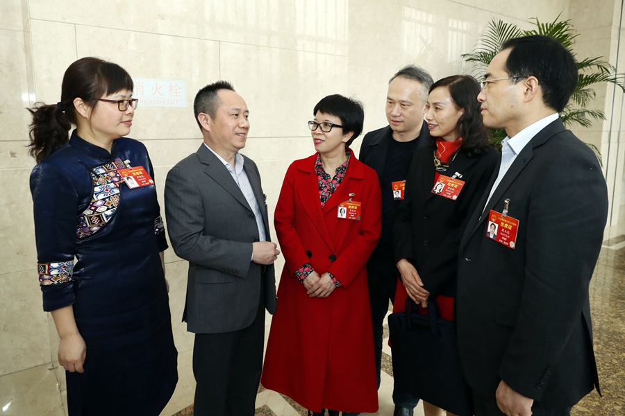 3月4日,来自医疗卫生行业的庹勤慧、张涤、雷冬竹、杨尚真、胡春莲和戴立忠代表(从左至右),就卫生与健康话题展开讨论。他们认为,要以基层为重点,以改革创新为动力,预防为主,中西医并重,将健康融入各项有关政策,实现人民共建共享。湖南日报记者 罗新国 摄